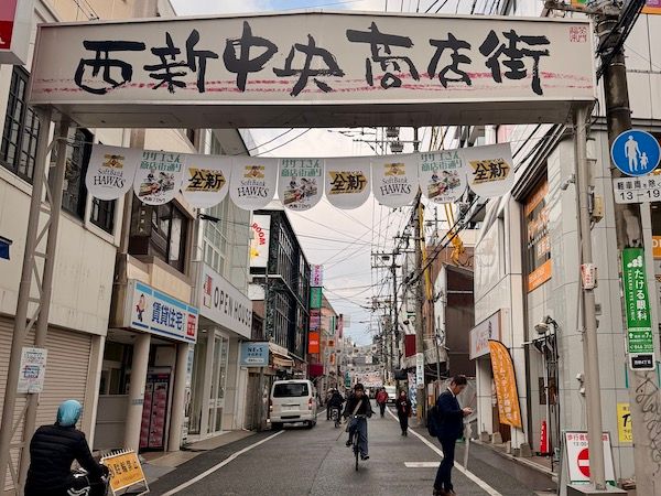 明治通り側から行く場合には、PRALIVAから商店街方面に横断歩道を渡ってすぐ。福岡市地下鉄空港線西新駅の4A出口が1番近いです。