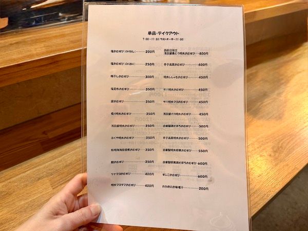 おむすびは単品1個から注文可能で、シンプルな塩おむすび(海苔なし200円)からちょっと贅沢なすじこおむすび(600円)まで、なんと23種類も♡どれにしようか迷いますよね〜 実は、明太子だけでも数種類あるんですよ!食べ比べも楽しめそう♪