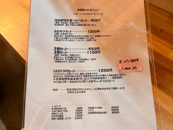 お得なセットメニューもあります! トッピングもいろいろあって、盛り盛り乗せて、自分好みの豪華な朝ごはんを作れそうです! 皆さんはどんなおむすびセットにしたいですか?私はせっかくなので、西新店限定のメニュー「SASIYORIセット」をいただくことにしました♡