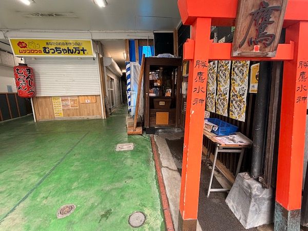 西新中央商店街入り口から歩いて30歩(数えましたっ) 右手に見える小さな鳥居、勝鷹水神の奥に続く通路を入ります。