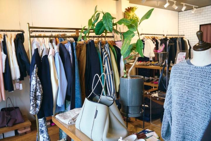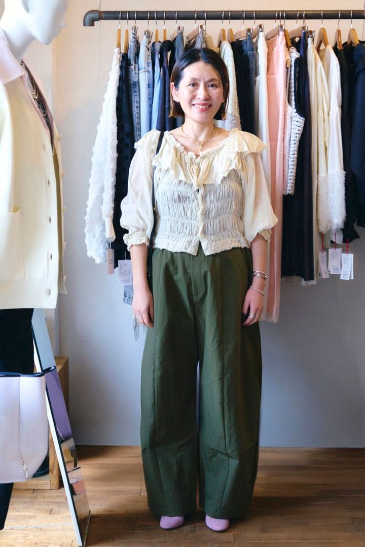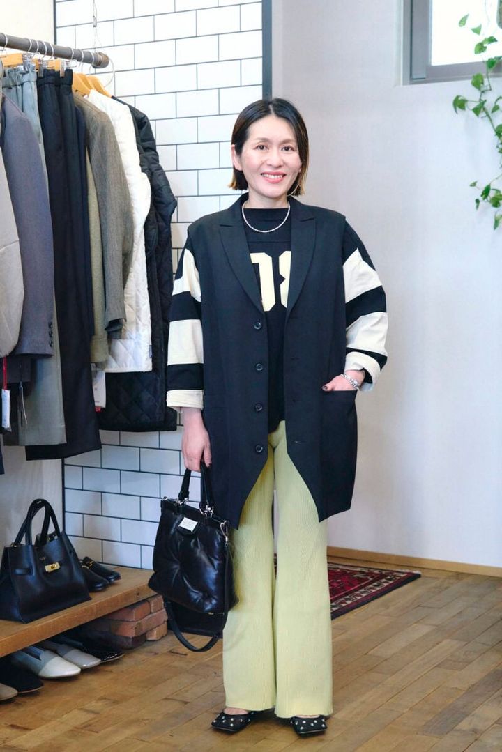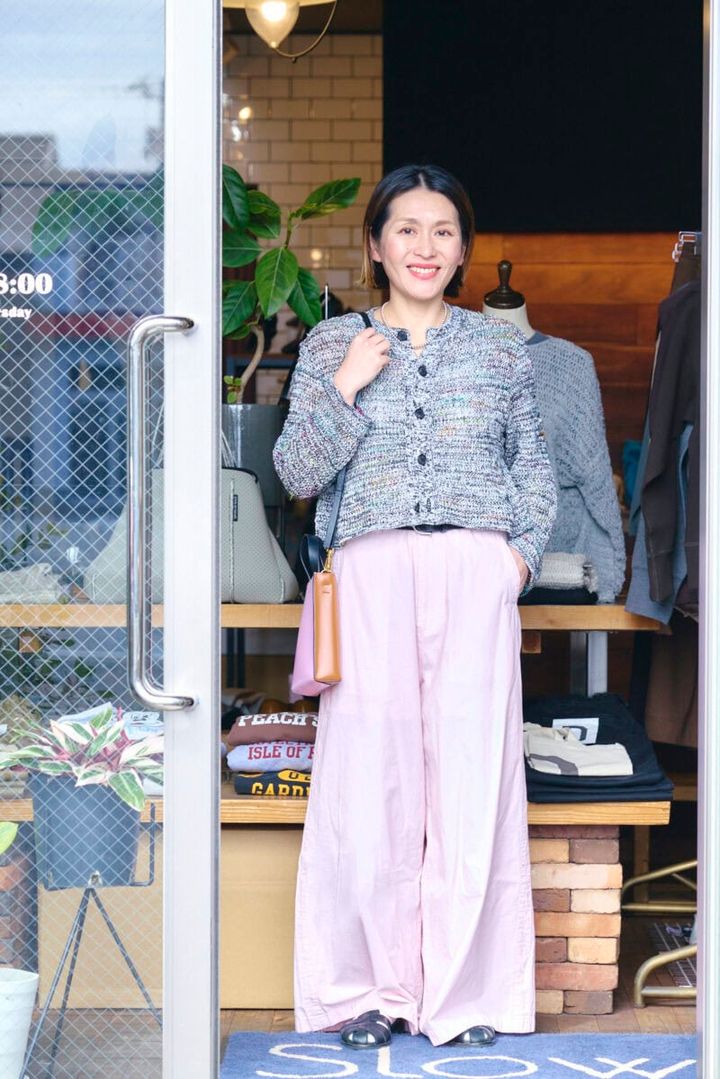 ファッションが好きで、文化女子短期大学専攻科で学び、「トゥモローランド」や「バーニーズニューヨーク」などの大手セレクトショップでキャリアを積んだ川口史子さん。35歳のとき、千葉市郊外にセレクトショップ「Slow(スロウ)」をオープンしました。「おかげさまでこの3月に12年目を迎えました。コーディネイトするのが好きで、お客さま一人ひとりの悩みに寄り添ってその方の魅力を引き出す着こなしを提案しています」と川口さん。150cm台前半の小柄さを感じさせない秘訣は、「ボリュームのあるアウターを着るときは、足元をヒールアップさせたり、ワイドパンツには上半身をコンパクトにさせたりと、全身のバランスを調整します」(川口さん)。巧みな体型カバーをしながら、フリルブラウスを足して「甘辛ミックス」に、ヴィンテージTシャツを重ねて「ヴィンテージミックス」にするなど、ミックス感が絶妙です。