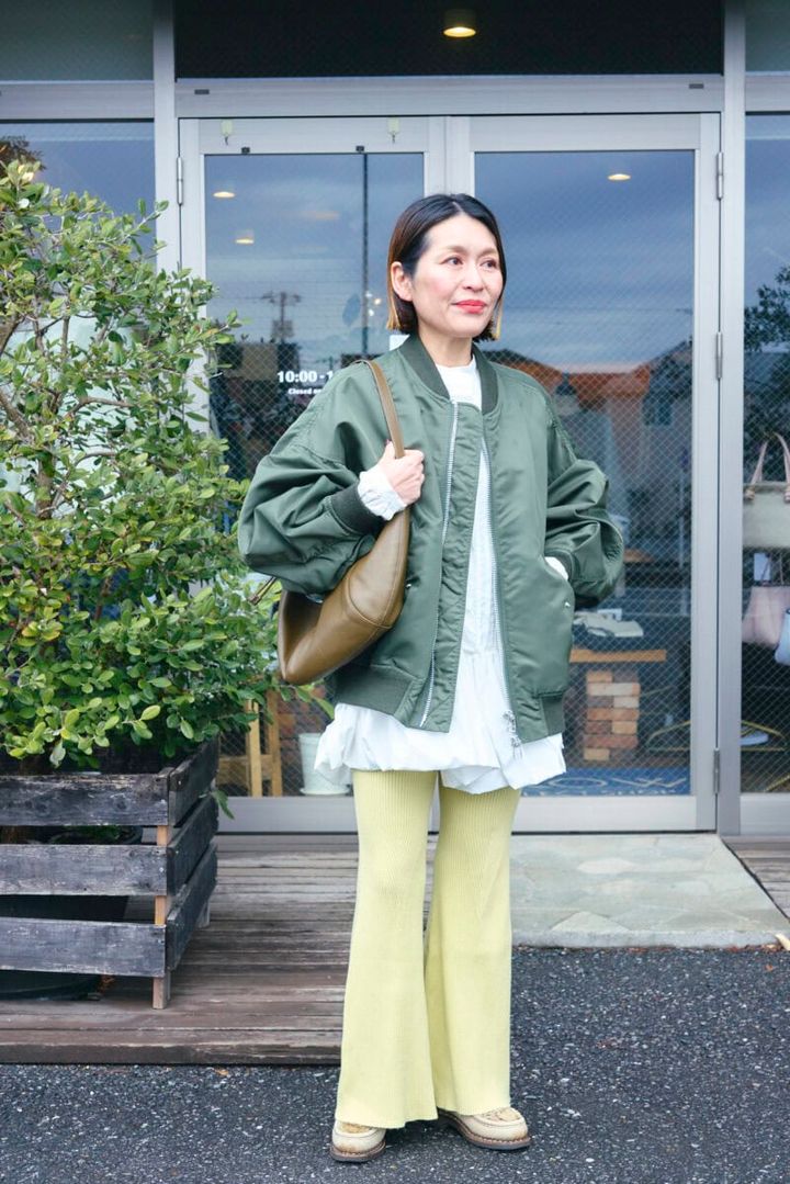 春っぽいイエローのパンツを「甘辛ミックス」に着こなすには? 「裾がバルーンになっている甘めのブラウスを着て、大きめのMA-1をはおって、バランスをとりました」と川口さん。