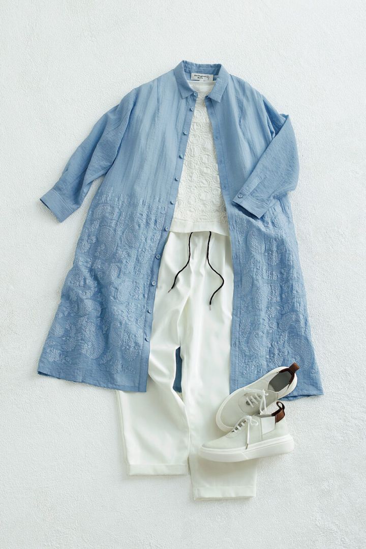 ドット刺しゅうのカットソーとストレッチパンツは、シャツワンピースをはおってIラインシルエットに。