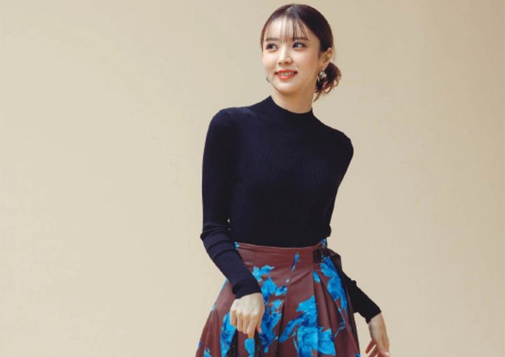 ニット¥11,000/マイストラーダ 花柄スカート¥23,100/FRAY I.D ルミネ新宿2店 ピアス¥2,640/アネモネ(サンポークリエイト) バッグ¥38,500/ジャンニキ アリーニ(ジャンニ キアリーニ 銀座店) ブーツ¥28,600/ダイアナ(ダイアナ 銀座本店)