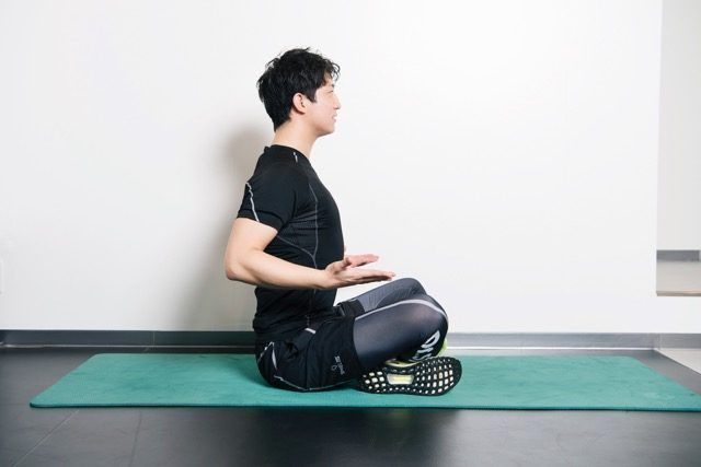 床にあぐらで座り、背骨を上へ長く伸ばします。両腕は床と水平になる高さで前へ伸ばし、手のひらは下向きに。肩に力が入らないよう、首を長く保ちます。ここでまず「背中を広げる」イメージを持ちましょう。