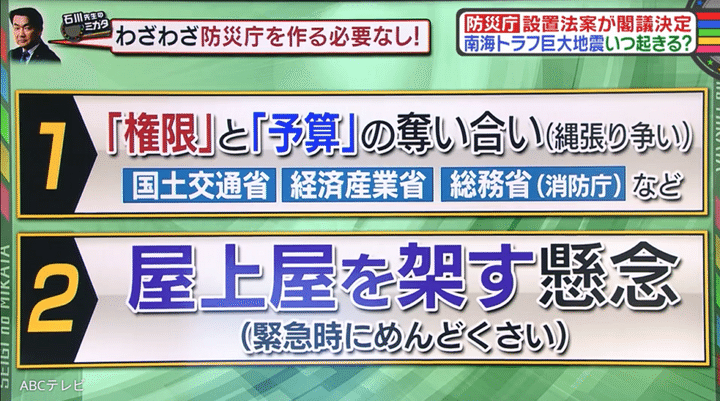 一方、経済産業省の元官僚でコメンテーターの石川和男氏は、防災庁の政策趣旨自体は「賛成」と強調しつつ、「ムダなポストが増えるだけ……」「わざわざ防災庁を作る必要なし!」と主張。その理由は、国土交通省や経済産業省、総務省(消防庁)などによる「権限と予算の奪い合い」が起きるからと、「屋上屋を架す(=二度手間になる)懸念」があるからだ。