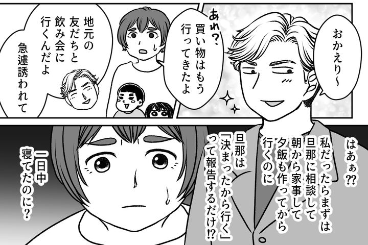 私はセイカ(30代前半)。4歳のタケと1歳のミオを育てています。タケは体が弱く、風邪をこじらせて入院をしたこともあるので、子どもたちの様子を注意深く見ながら育児をしています。私は仕事と家のことで忙しく、飲みに行ったり友人と遊んだりすることもなかなかできないのですが、旦那のジュンジ(30代前半)は月に2回ほど友人と飲みに行きます。飲みに行くのはいいのですが、私が逆の立場なら、家のことや子どものことをきちんと済ませてから行くと思うのです。