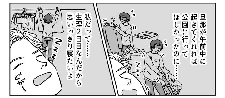 私は生理2日目でつらい中、朝から起きて朝ご飯、掃除、洗濯、洗い物をし、お昼ごはんを作って公園へ行き、スーパーに買い物へ行きました。