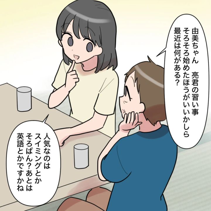 亮くんが少し大きくなると、周りで習い事を始める子が出てきました。「由美ちゃん、亮君の習い事そろそろ始めた方がいいかしら。最近は何がある?」と聞いてみると、「人気なのはスイミングとかそろばん?あとは英語とかですかね」と由美ちゃんが教えてくれました。