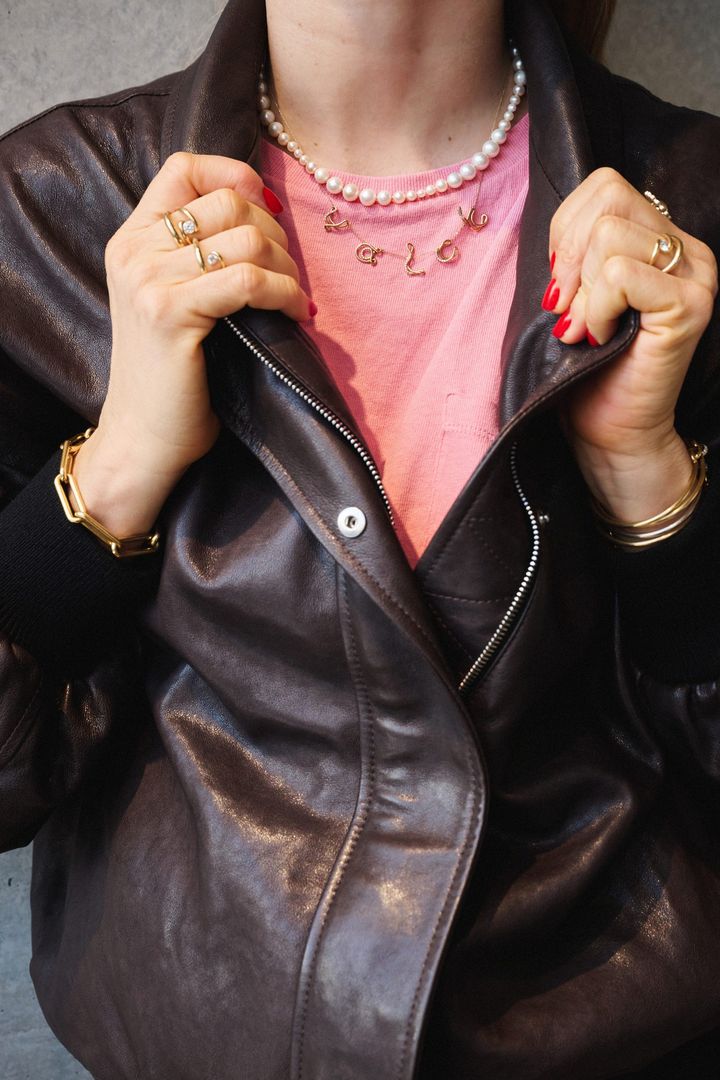 ブラウンのレザージャケットとピンクのカットソーという、都会的なカジュアルスタイルで取材に応じてくれたシャルロット。ローンチしたばかりのファインジュエリーコレクションから、胸元には大きさの異なるパールが連なったネックレスとレターネックレスをレイヤード。