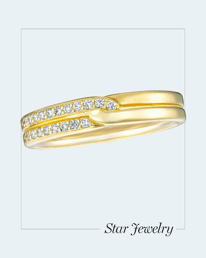 2本の輪をつないだような、コンテンポラリーなレイヤード風リング。ダイヤモンドとイエローゴールドをアシンメトリーに組み合わせたデザインも、スタイリッシュな雰囲気です。