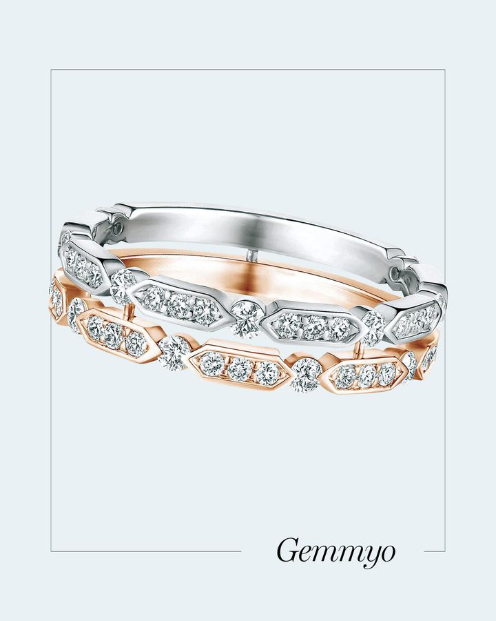 2011年に誕生したパリ発のモダンジュエラー、ジェミオから届いたのは、ホワイトゴールドと柔らかなピンクゴールドのリングを、バーでつないだ繊細なデザイン。2本のリングの間から肌がのぞく抜け感も、今の気分です。