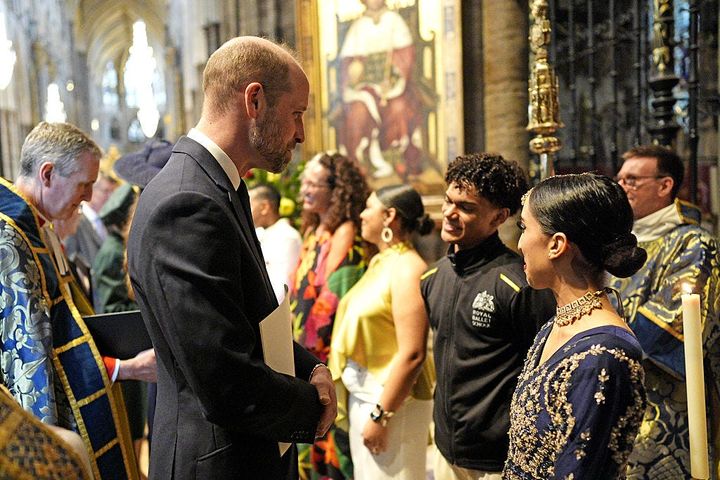 式典の終わりに、パフォーマーたちと和やかに言葉を交わすウィリアム皇太子。