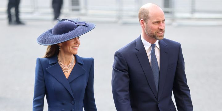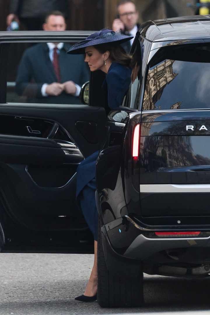 ウィリアム皇太子とキャサリン皇太子妃は、いち早く到着した高位ロイヤルメンバー。ともに、気品溢れるダークブルーとネイビーの装いで揃えていました。