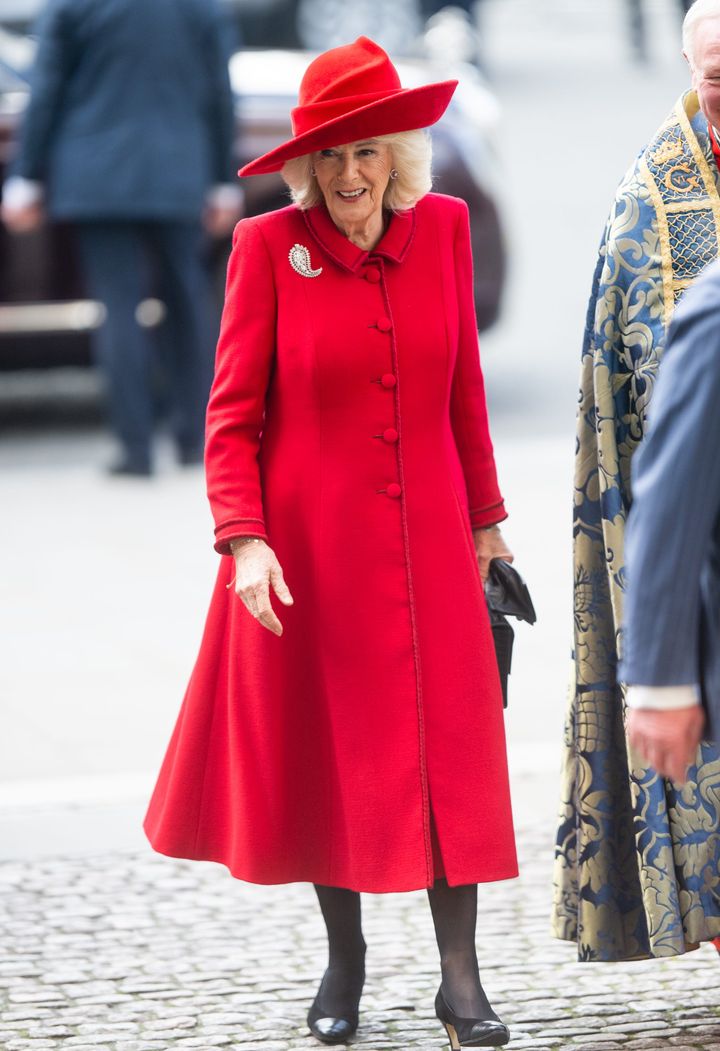 カミラ王妃は、「フィオナ・クレア」による赤いクレープウールのコートドレスを着用し、胸元には、もともとはクイーン・マザー(エリザベス皇太后)が所有されていた「カルティエ」によるダイヤモンドのパームリーフのブローチを身に着けていました。