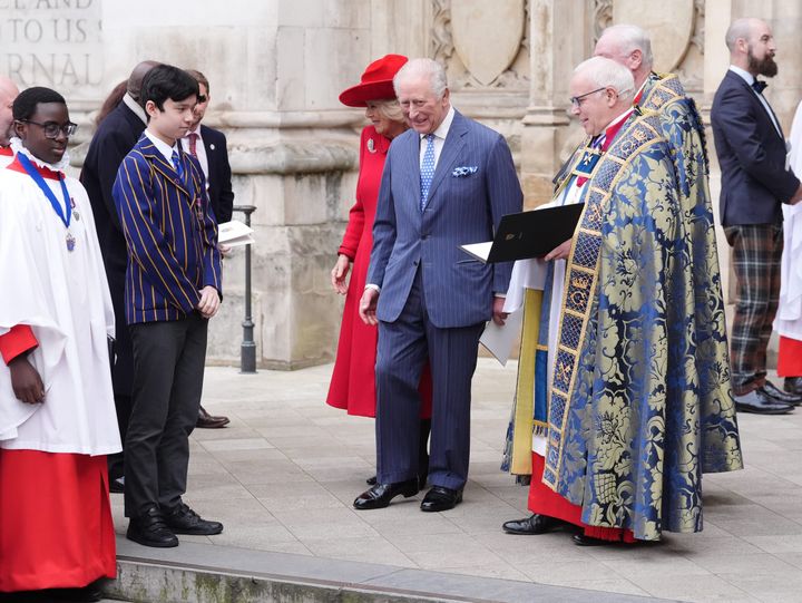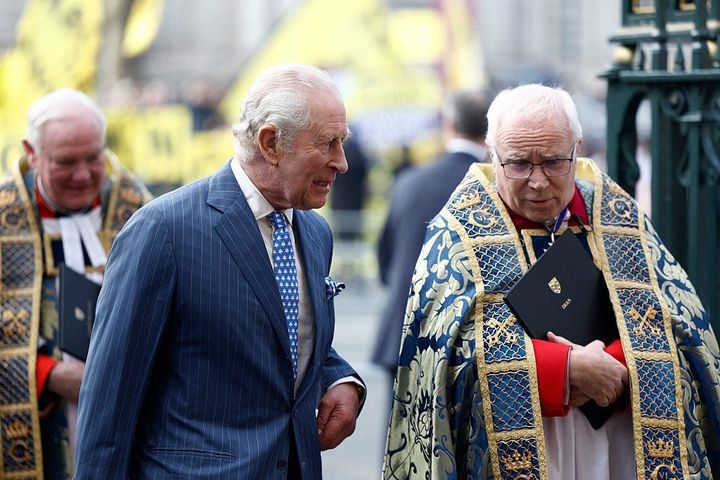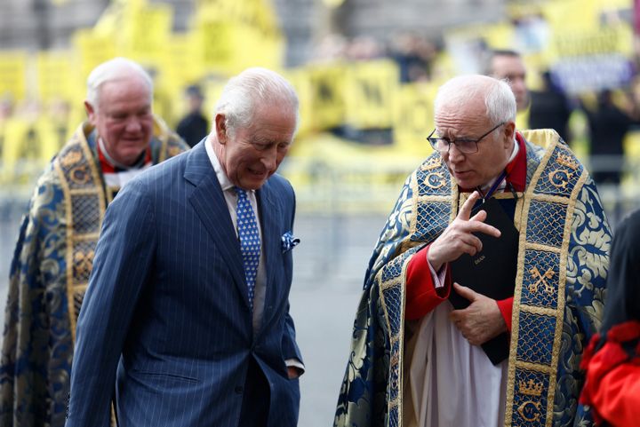 コモンウェルス・デーの礼拝が始まる前、ウェストミンスター首席司祭であるジョン・ホール氏と歓談するチャールズ国王。