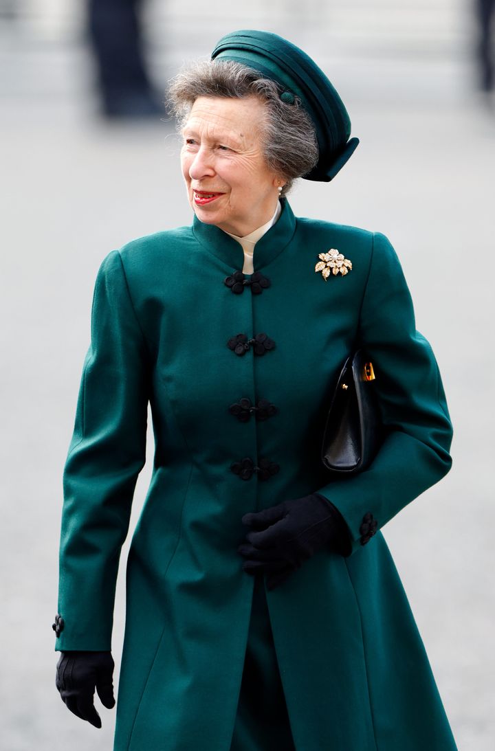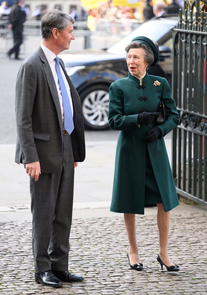 深みのあるダークグリーンのコートドレスにお揃いの帽子を合わせた、気品漂うアン王女。寺院に到着の際、夫であるティモシー・ローレンス海軍中将と談笑する姿も。