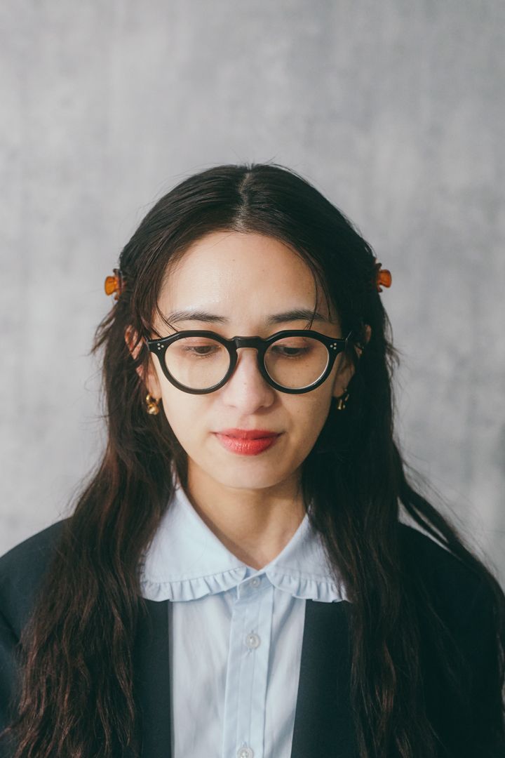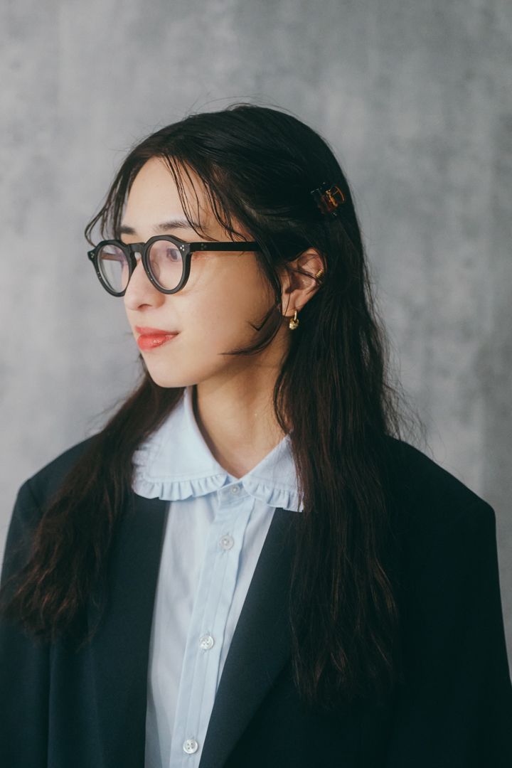 ブラウスのフリルがちらっと見えて、ジャケットスタイルのアクセントに。フリル好きのさゆりさんならではのチョイス! 黒の太フレームのメガネで甘さをほどよくセーブ。