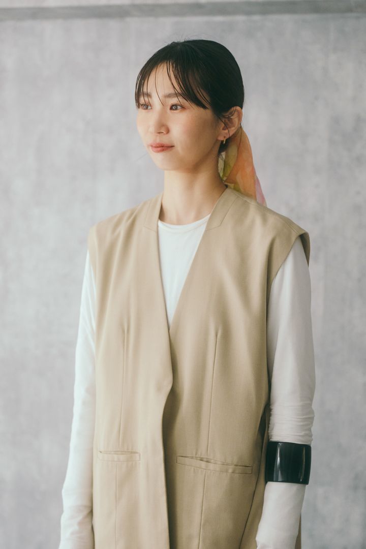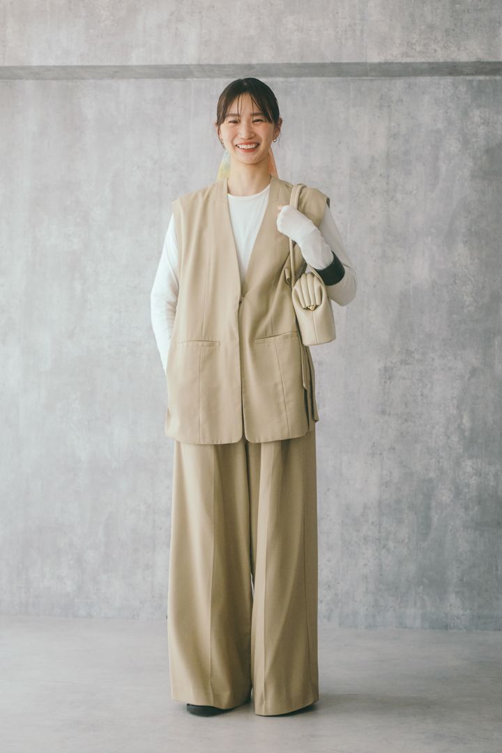 どんなインナーとも合わせやすいジレは、1枚あると便利なアイテム。やわからなトーンで全身をまとめているので、太めのバングルがアクセントに。