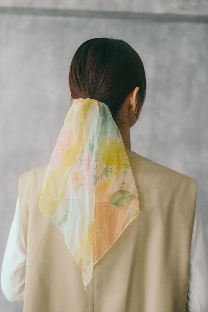 祖母から譲り受けたスカーフをヘアアクセに。お団子ヘアをつくって、スカーフをゴムでくるっと留めれば完成の簡単ヘアアレンジ!