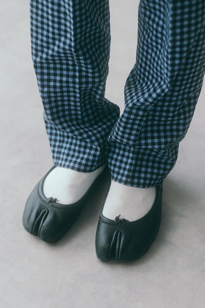『ユニクロ』のソックスは真っ白な色味がお気に入り。『メゾン マルジェラ』のタビシューズとも相性抜群。普段からパンツコーデが多いさゆりさんは、デイリーシーンではこのチェックパンツにゆったりめのスウェットトップスを合わせて着ているそう。