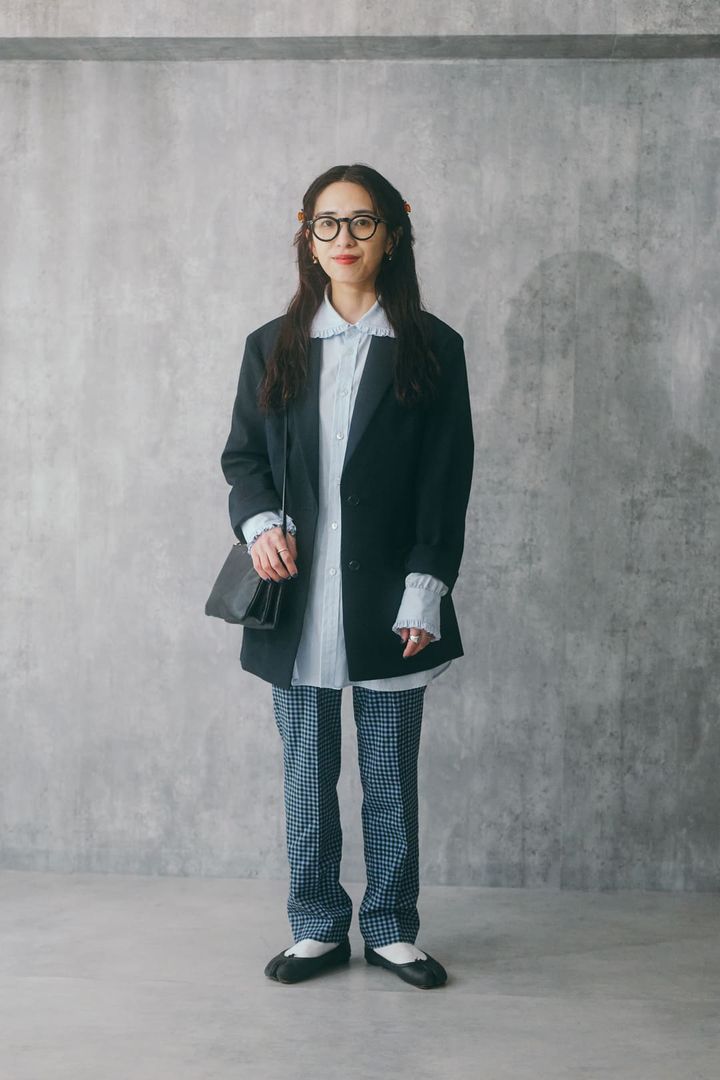 「全体的にブルーでまとめた、オケージョンコーデです。ビッグシルエットのジャケットは黒だと重く見えそうなので、ネイビーをセレクト。中には水色のブラウスを着て、軽やかに。ブラウスは裾をアウトして着てみましたが、ジャケットとのバランスがよくて、グッド! パンツはあえてブルーのチェック柄を選び、着こなしに遊びを入れてみました。メガネやバッグなど小物は黒を使って、かっちり感を演出♪」