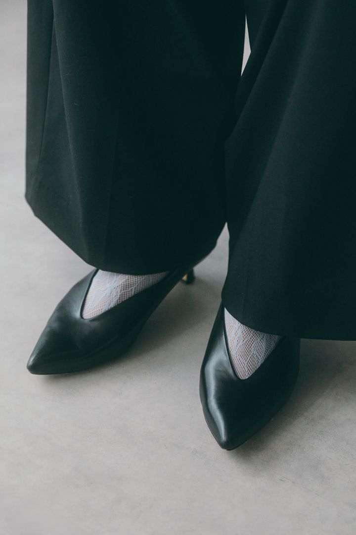 『靴下屋』のタイツは、実はキッズサイズの150センチ。ブラウスと合うようにレース素材を投入しつつ、カラーはブルーを選んでアイメイクとリンク。ブラックコーデのワンポイントにも♪