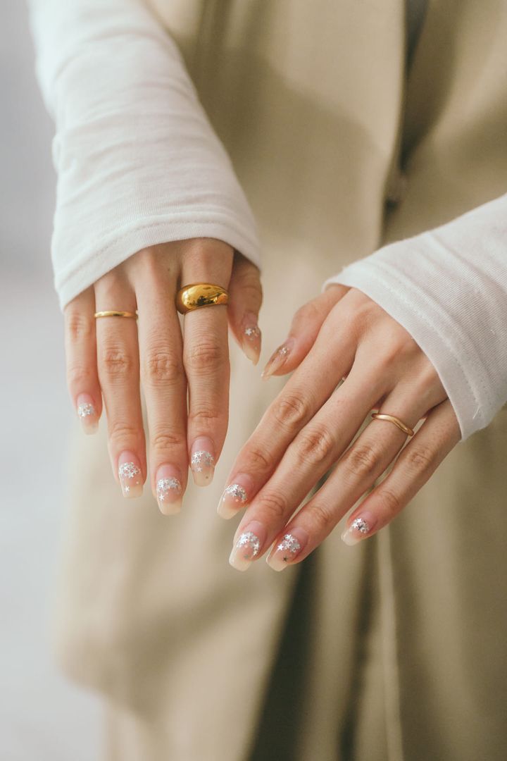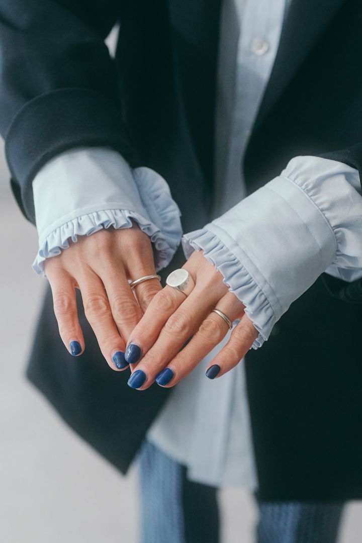 洋服と合わせてネイルもブルーに。リングはシルバーで揃えて、スタイリッシュさを演出。『トムウッド』の重厚なリングはコーデのアクセントに。