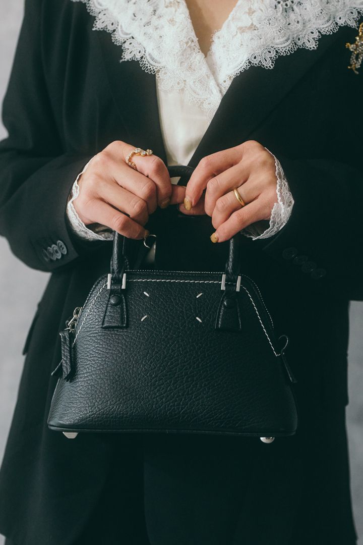 バッグはフォーマルな黒をチョイス。コンパクトなサイズ感の『メゾン マルジェラ』のバッグは、きちんと感も演出できる優れもの。
