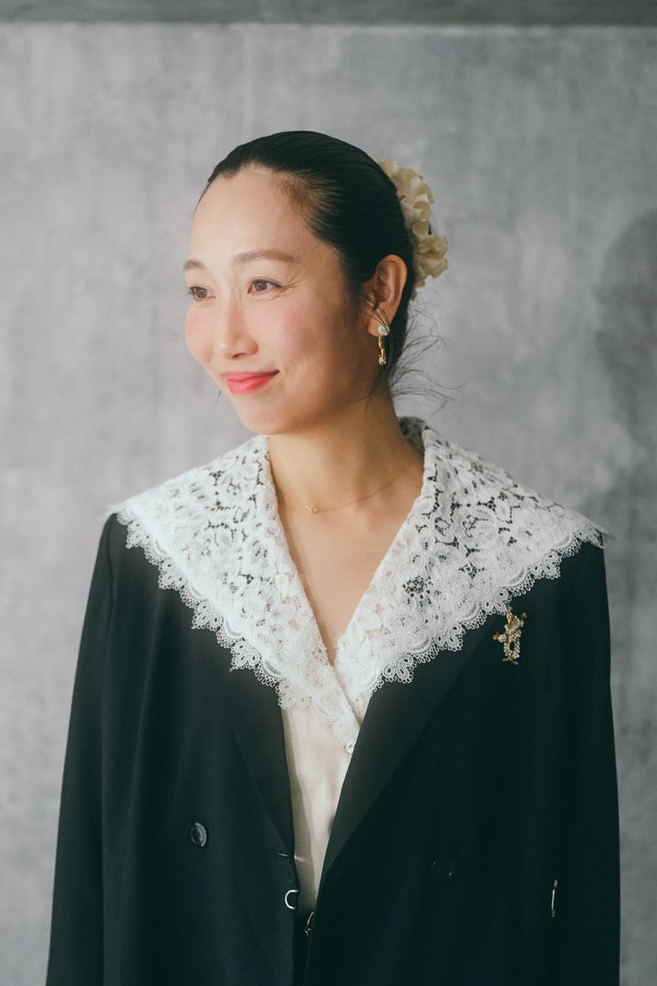 レースのビッグカラーが可愛いブラウス。襟をジャケットの外に出して、顔周りをぱっと華やかに。襟を中にしまうとまた印象が変わるので、着こなしのバリエーションが広がる。普段はデニム合わせで着ることもあるそう。