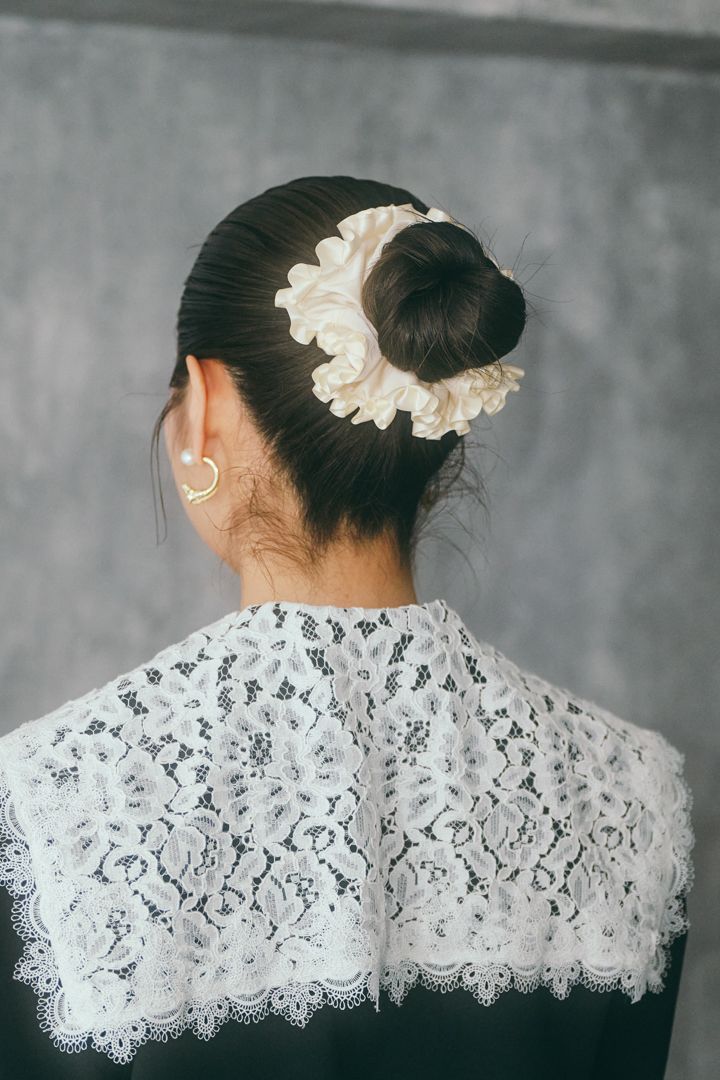 ヘアは、お団子にして手軽にドレスアップ。ウェットな質感でタイトにまとめ、モードな雰囲気に。『ラコレ』のサテン地フリルシュシュで華やぎをオン。