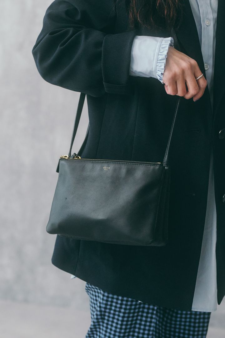 ほどよい大きさのバッグは『セリーヌ』のもの。シンプルなデザインなので、オケージョンに限らず使いやすい。コーデに品格を与えてくれるのも高ポイント。