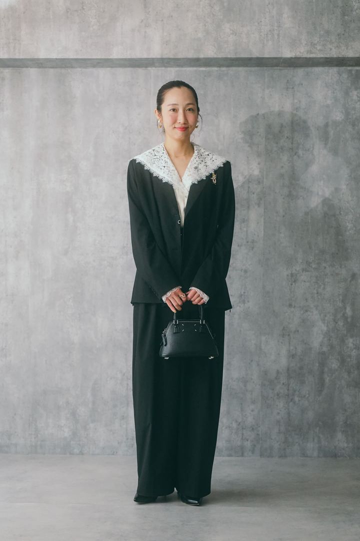 「セットアップは『メゾンスペシャル』のもの。オーバーサイズ気味で、メンズっぽい雰囲気なので、レースカラーのブラウスと合わせました。さらに、タイツでもレースを取り入れて、甘さをトッピング。ほどよく華やかさも演出できるので、入学式にぴったり♪ このセットアップは、合わせるアイテムで印象が変わるので、重宝しています。インナーにTシャツを使って、デイリーでも着回す予定! 」セットアップ/メゾンスペシャル、ブラウス/プランク プロジェクト、タイツ/靴下屋、シューズ/ル タロン、バッグ/メゾン マルジェラ、シュシュ/ラコレ