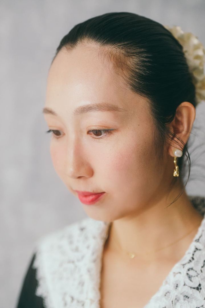 両サイドにつけたヘアクリップはタイのマーケットで購入。ナチュラルなダウンヘアのポイントに活躍。ネットで購入したゴールドのピアスで、顔周りを華やかに。