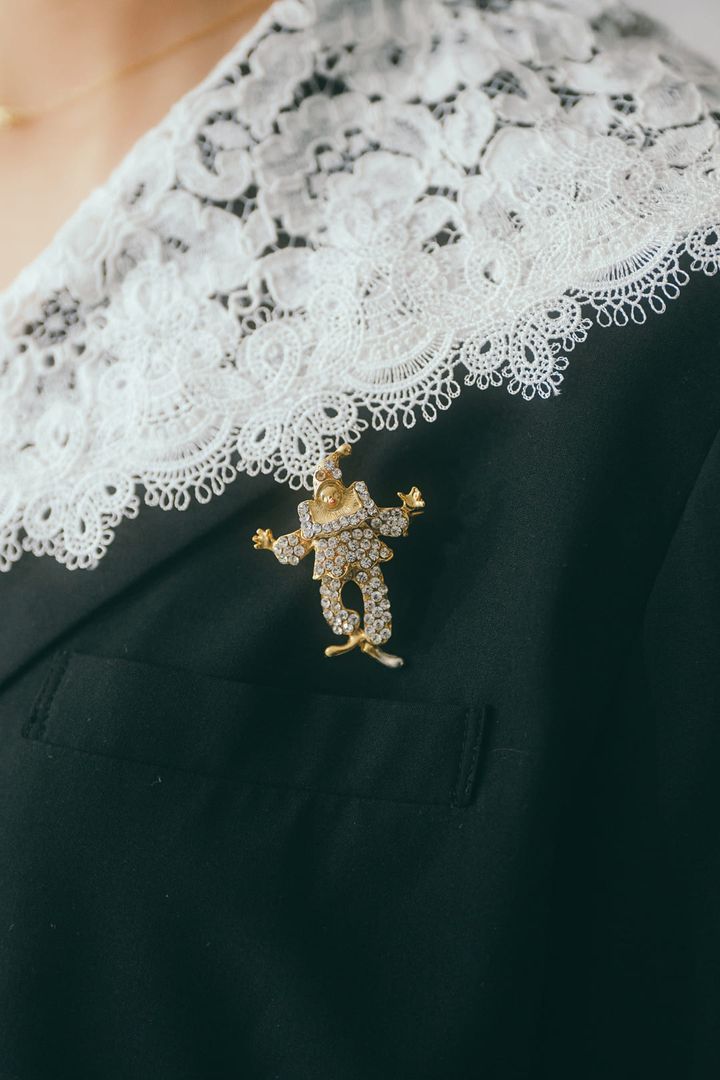 ジャケットの襟元には、ブローチをオン。祖母から譲り受けたものであるピエロモチーフのブローチが、チャーミングさをプラス。