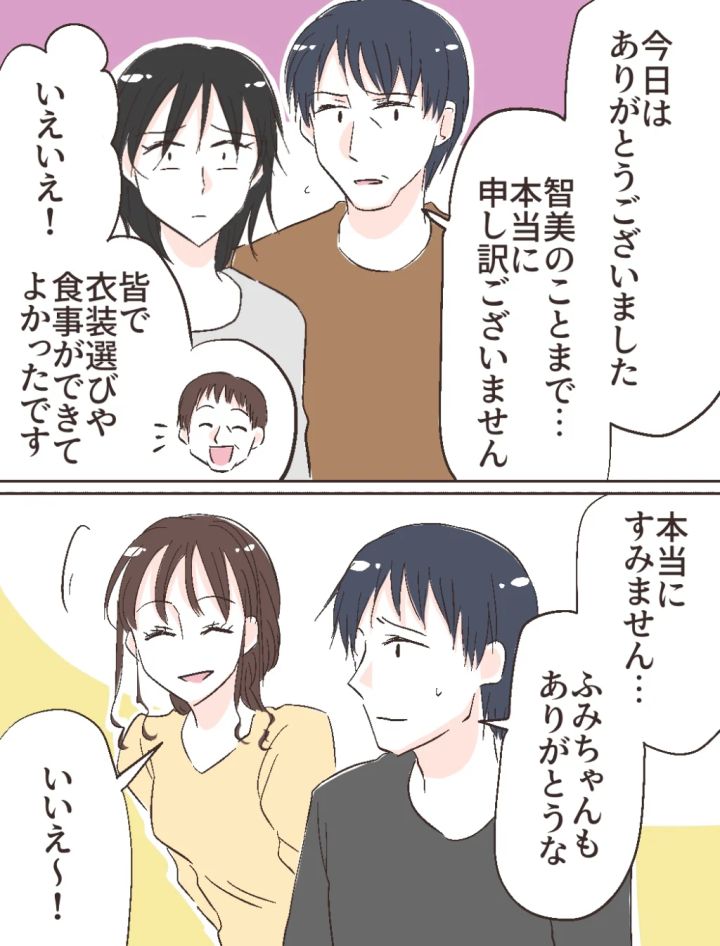 食事を終えお店を出ると、「今日はありがとうございました。智美のことまで・・本当に申し訳ございません」と申し訳なさそうに私たち家族に謝る義父の隣で、智美さんはただ黙って立っていました。「いえいえ!皆で衣装選びや食事ができてよかったです」と父が笑顔で答えると、修吾も「本当にすみません。ふみちゃんもありがとうな」と申し訳なさそうに言いました。