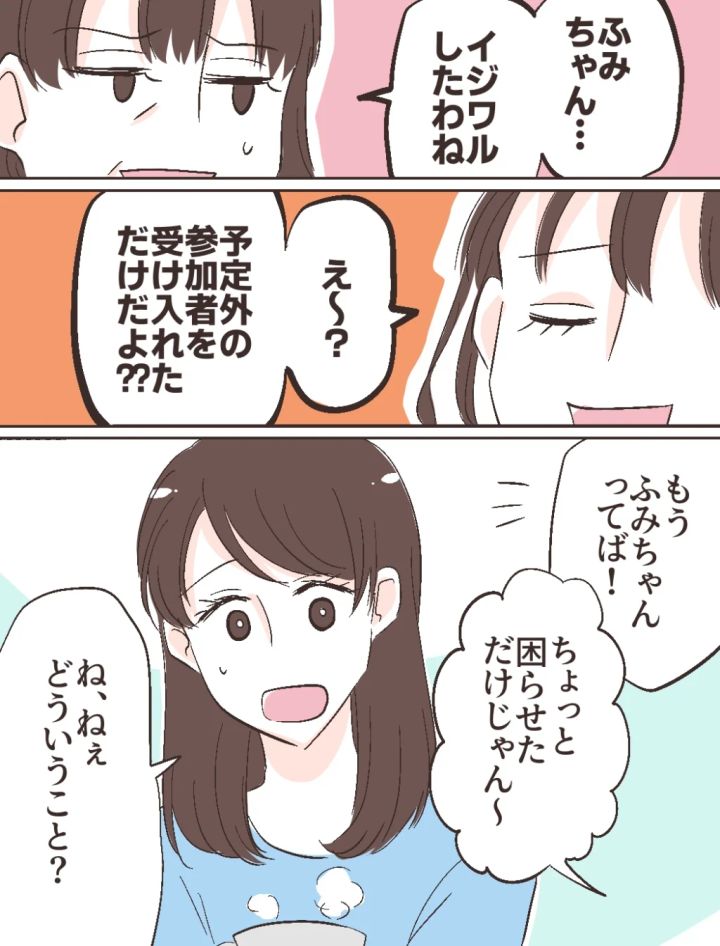 「ふみちゃん・・、イジワルしたわね」と疑いの眼差しを向けられたふみのは「え~?予定外の参加者を受け入れただけだよ??」ととぼけたように返しました。「もう、ふみちゃんってば!」「ちょっと困らせただけじゃん~」と二人が話している横で、私は訳が分からず「ね、ねぇ、どういうこと?」とちんぷんかんぷんでした。ふみのがイジワルしたって・・どういうこと?二人は何の話をしてるの??