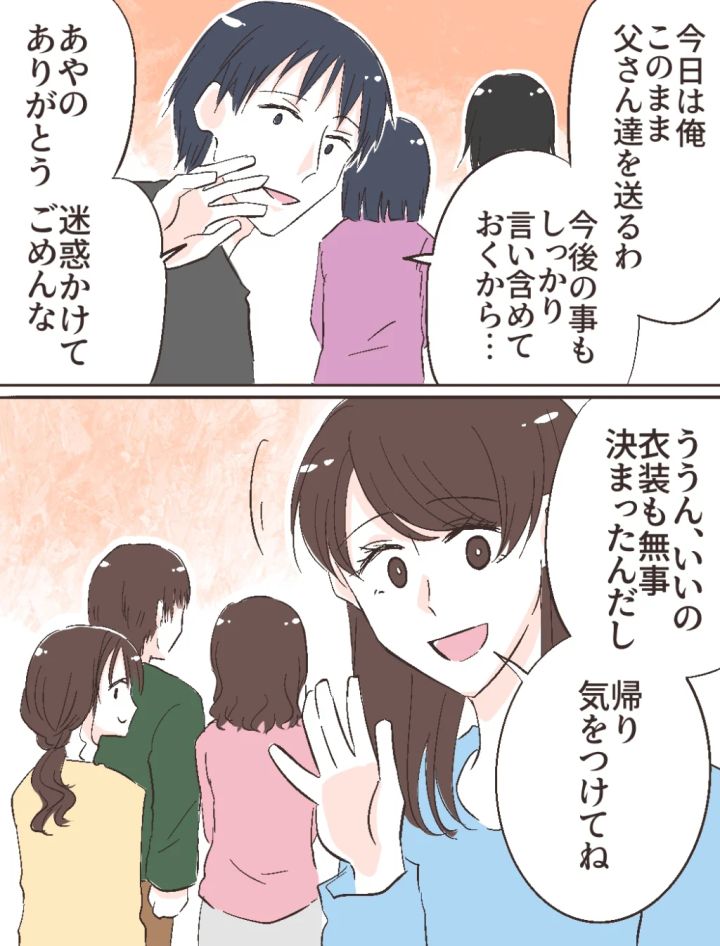 「今日は俺このまま父さん達を送るわ。今後の事もしっかり言い含めておくから・・。あやの、ありがとう。迷惑かけてごめんな」と最後まで申し訳なさそうにする修吾に「ううん、いいの。衣装も無事決まったんだし、帰り気をつけてね」と笑顔で返しました。だって、修吾は何も悪くない。修吾は智美さんを連れて来ないようにちゃんと伝えてくれていたのに、義母が勝手に連れてきてしまったのですから。
