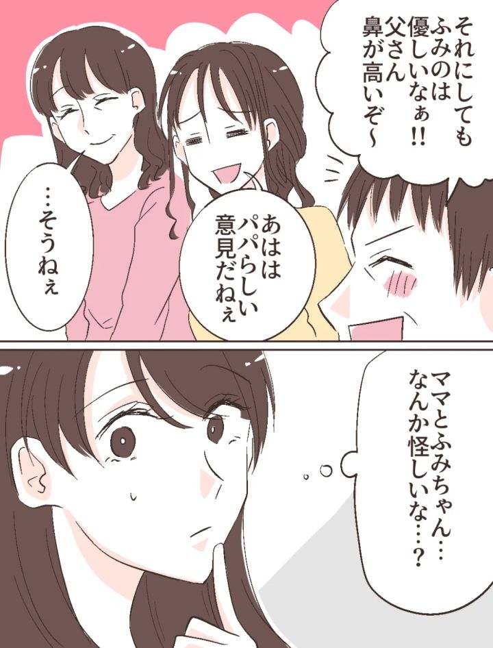 すると、「それにしても、ふみのは優しいなぁ!!父さん鼻が高いぞ~」と智美さんが一緒に食事に行けるよう予約を変更したふみののことを父が褒めました。「あはは。パパらしい意見だねぇ」と笑うふみのの横で「・・そうねぇ」と笑顔だけれど何か言いたげに見える母。父は何も感じていないようですが、ママとふみちゃん・・なんか怪しいな・・?