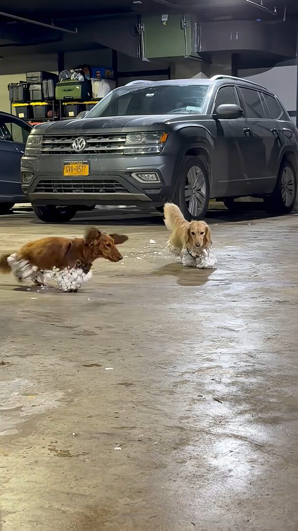 そこにいたのは、2匹のダックスフンド。 どうやら、外でいっぱい遊んできたようです。