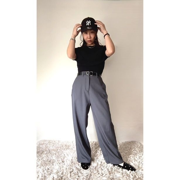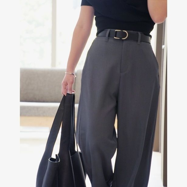 パンツ以外のアイテムをすべて黒で統一。重くなりすぎないよう、肩を少し出したトップスなどで「抜け感」を出すのがポイントです。黒の引き締め効果と、グレーパンツのきちんと感が合わさり、クールでスタイリッシュな印象に。