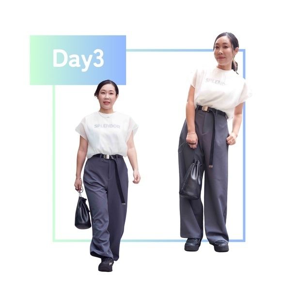 まずは、にーよんさんによる「NGコーデ」と「OKコーデ」を比較してみましょう。本当に同じ体型なの?と疑いたくなるほどの差に注目です。