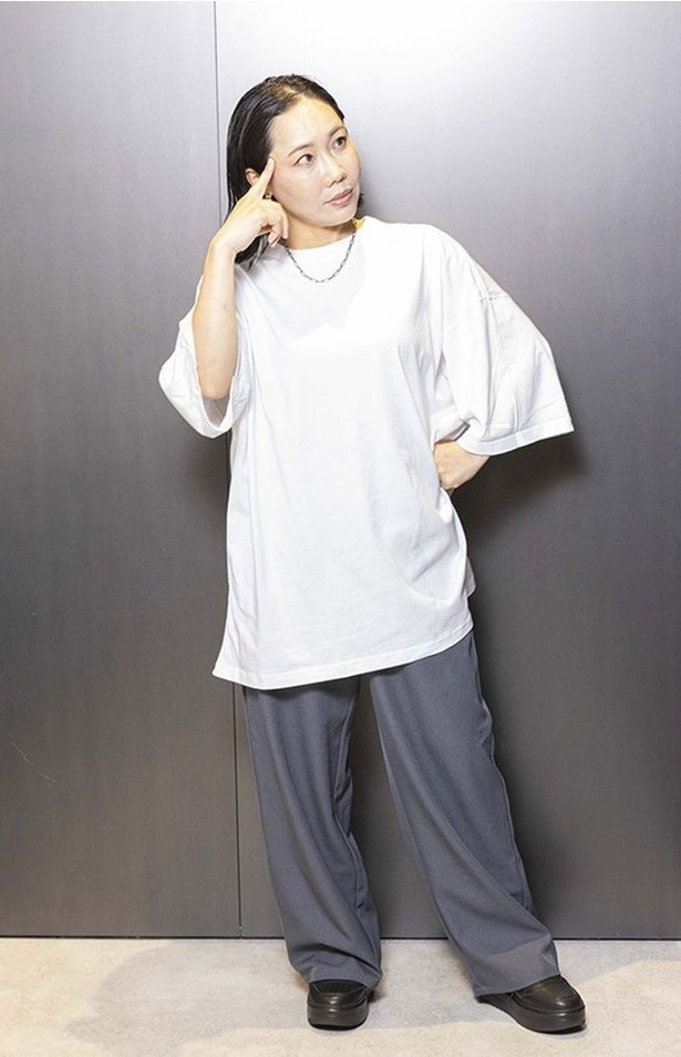 にーよんさんの正解コーデは、「股上が深めのハンサムパンツ」を主役にしたスタイル。ポイントは、お腹やお尻をトップスで隠すのではなく、パンツの中に収めてしまうこと! 股上が深いパンツをウエストの一番細い位置で履くことで、下腹をカバーしつつ「細い部分」だけを強調。