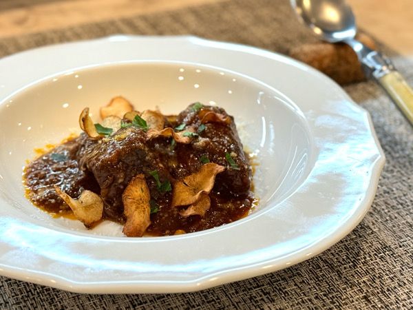 メインのお肉料理は「グーラーシュ」。 ハンガリーをはじめ、オーストリアやドイツ、北イタリアなどで食べられている煮込み料理です。こちらでは牛の肩ロースを一度焼いてから、赤ワインとトマトで煮込みます。香りの決め手になるのがパプリカ。お店では夏の一番おいしい時期のパプリカを乾燥させ、自家製のドライパプリカにして使用しているそうです。 仕上げに菊芋のフリットを添え、香ばしい食感も楽しめる一皿でした。