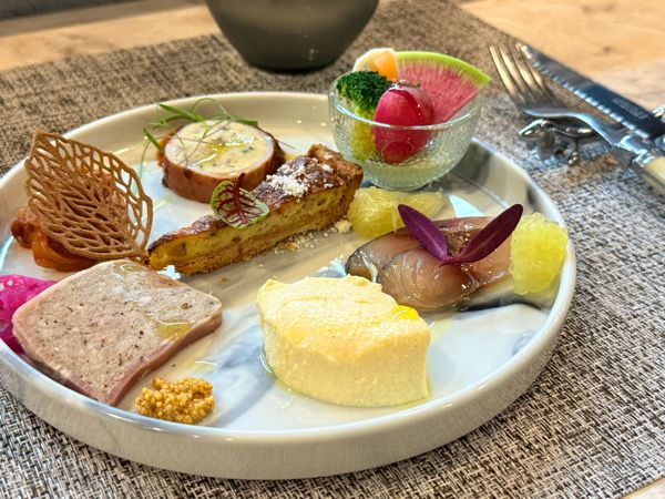 一見かわいらしいワンプレートですが、料理の説明を聞くとその奥深さに驚きます。カリフラワーをソテーしてペーストにし、自家製コンソメを合わせた一品や、牛乳で玉ねぎやキノコをじっくり煮詰めたレデュクションを添えた自家製パテ。和歌山のサバは魚醤「コラトゥーラ」に漬けて乾燥させ、燻製の香りをまとわせた“サバの生ハム”として提供されます。