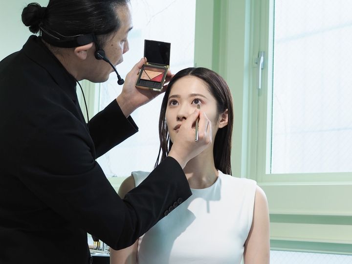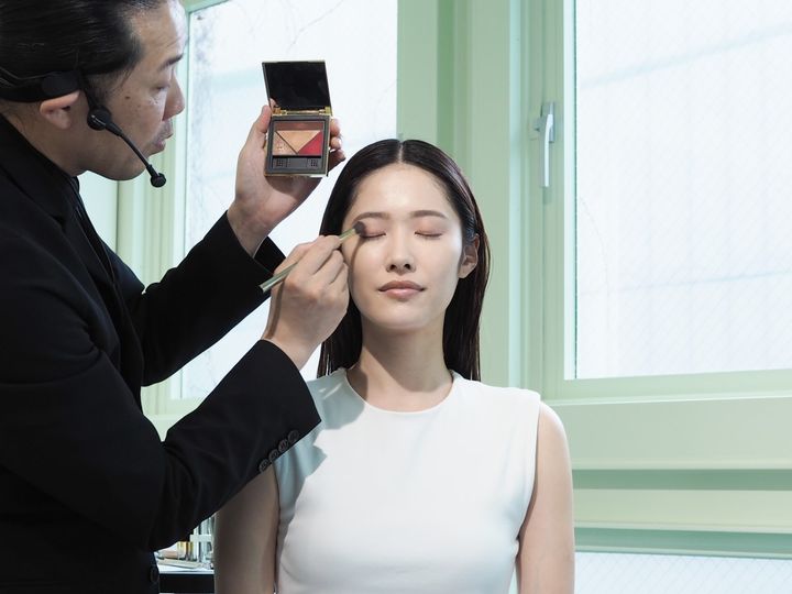 そんなメイクのポイントとなるのは、「プラダ タッチ」をチークだけでなく、目元や唇にシームレスに溶かしていくような感覚で使用し、色や質感をそれぞれ重ねることだといいます。