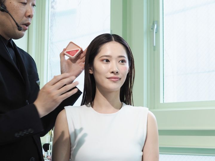 最後はチーク。「プラダ タッチ」の「P75 チューリップ」をまずは黒目の下あたりに大胆にのせ、タッピングして広げていきます。ある程度タッピングでなじませたら、ぼかす作業に。肌表面を軽いタッチで撫でるように滑らせると、肌との境界線が溶けるようにシームレスに繋がっていくのだとか。