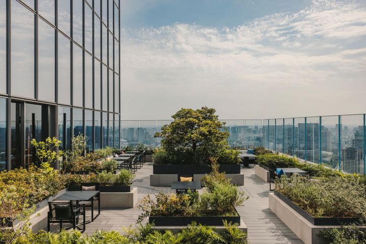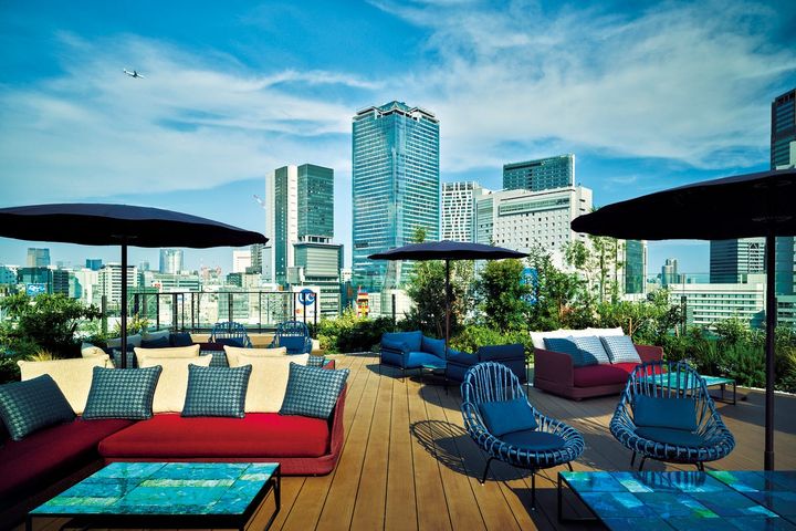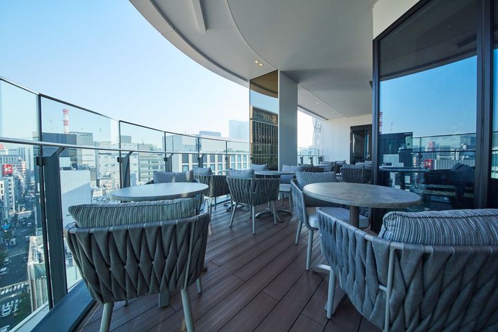 テラス席は10階にあり、高層ビル群に囲まれた空間は、圧倒的なスケールで高揚感たっぷり。思わず気分が上がる!