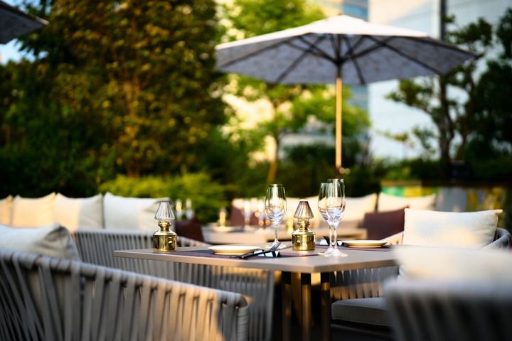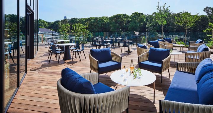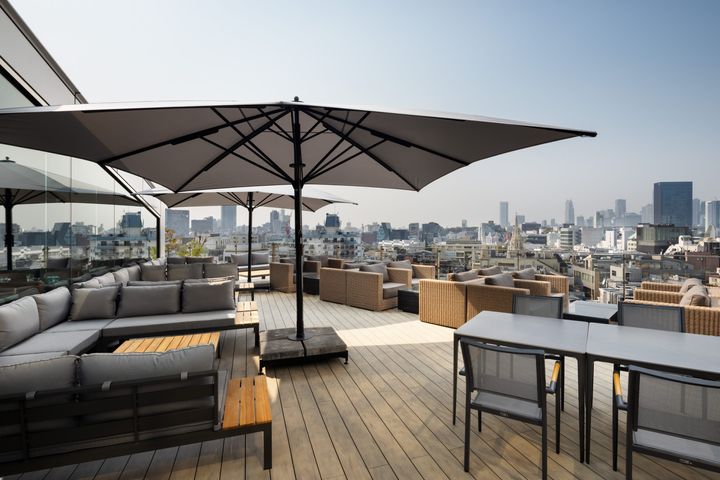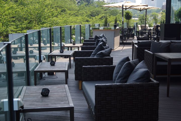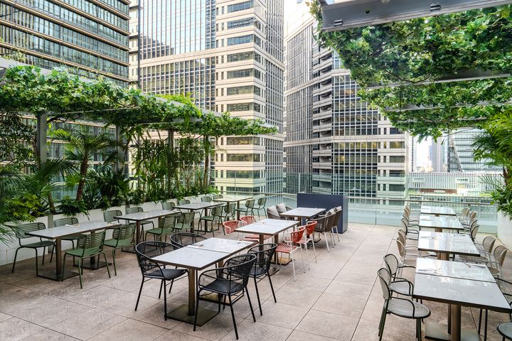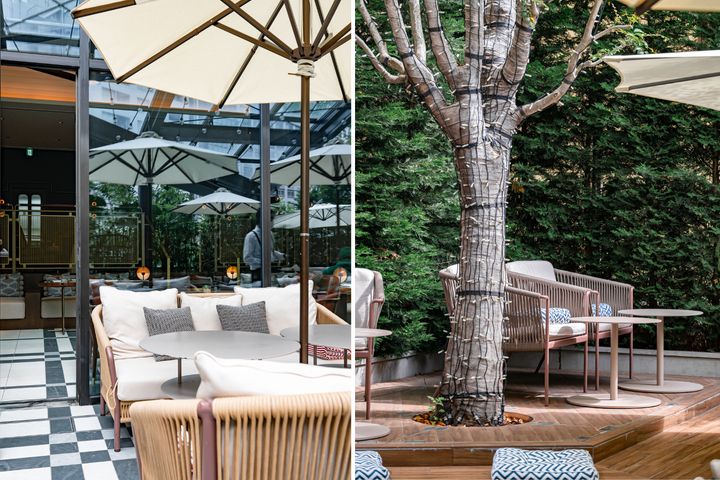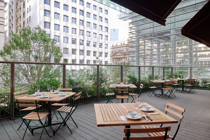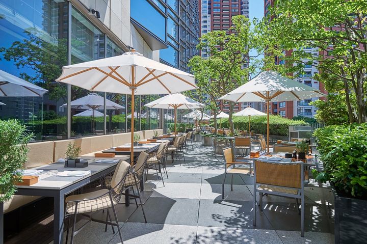 ニューヨークの人気デザイナー、ローマン&ウィリアムスがデザインした空間に、スタイリッシュな家具が配置された寛ぎの空間だ。視界が開けた都会のオアシスのようなテラス席は、オフィス街を感じさせない開放感がある。