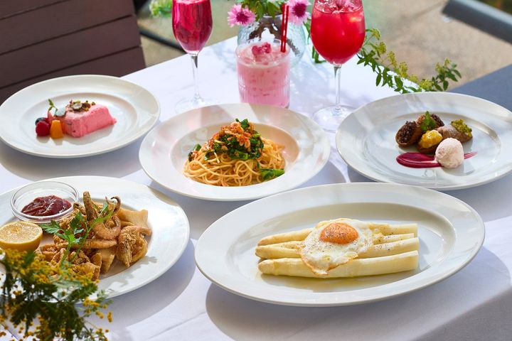 2026年3月16日(月)からは、香ばしい桜エビのうま味と、ほろ苦い菜の花の風味がオリーブオイルソースに溶け合う「桜エビと菜の花のパスタ」や、目玉焼きを絡めることでホワイトアスパラガスの甘みとコクが広がる「ホワイトアスパラの目玉焼き乗せ」、イタリア・シチリア島発祥のアイスケーキを、桜フレーバーに仕立てた「桜のカッサータ」など、春の新作アラカルトメニューも登場。